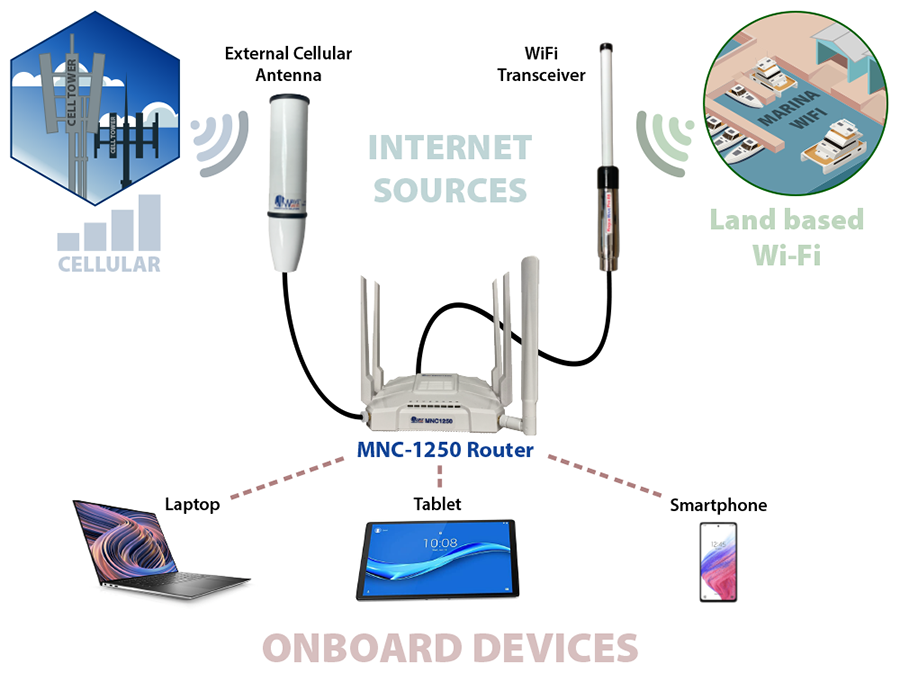 Wave WiFi’s line of Mobile Broadband Routers are cost-effective broadband source selectors suitable for offshore cruising boats, sport fisherman, or super-yachts. The MBR-500 and MNC-1200 can handle up to four input sources such as Wave WiFi’s own Rogue Pro DB and your Fleet One, Iridium Pilot, Certus, Fleet Broadband, HughesNet, or mini-VSAT system. The MBR-550 and MNC-1250 models also handle up to four input sources PLUS an integrated global band LTE cellular modem for connecting to the Internet. MBR models also include a built-in 300mbps Wi-Fi access point and configurable WAN and LAN ports while MNC models add multi-active WAN support, gigabit ethernet, and dual-band 802.11ac Wi-Fi for highest performance. Use the MBR-550 and MNC-1250 cellular models with an additional external cellular antenna, or in conjunction with a cellular booster, to bring cellular Internet to the boat while underway miles offshore.